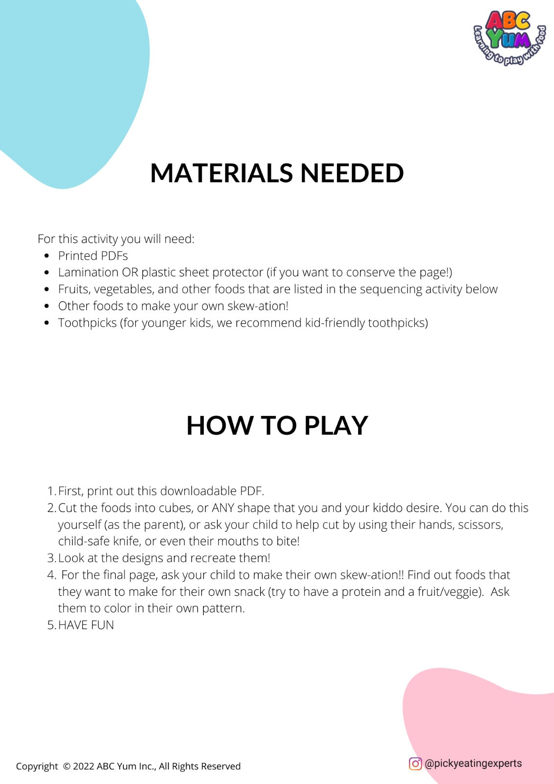 Travaillez sur les associations et la notion des séquences, tout en explorant différents aliments. Savourez une bonne collation équilibrée à la fin de l'activité. Assurez-vous de faire cette activité en famille afin de créer plusieurs mini-brochettes différentes!