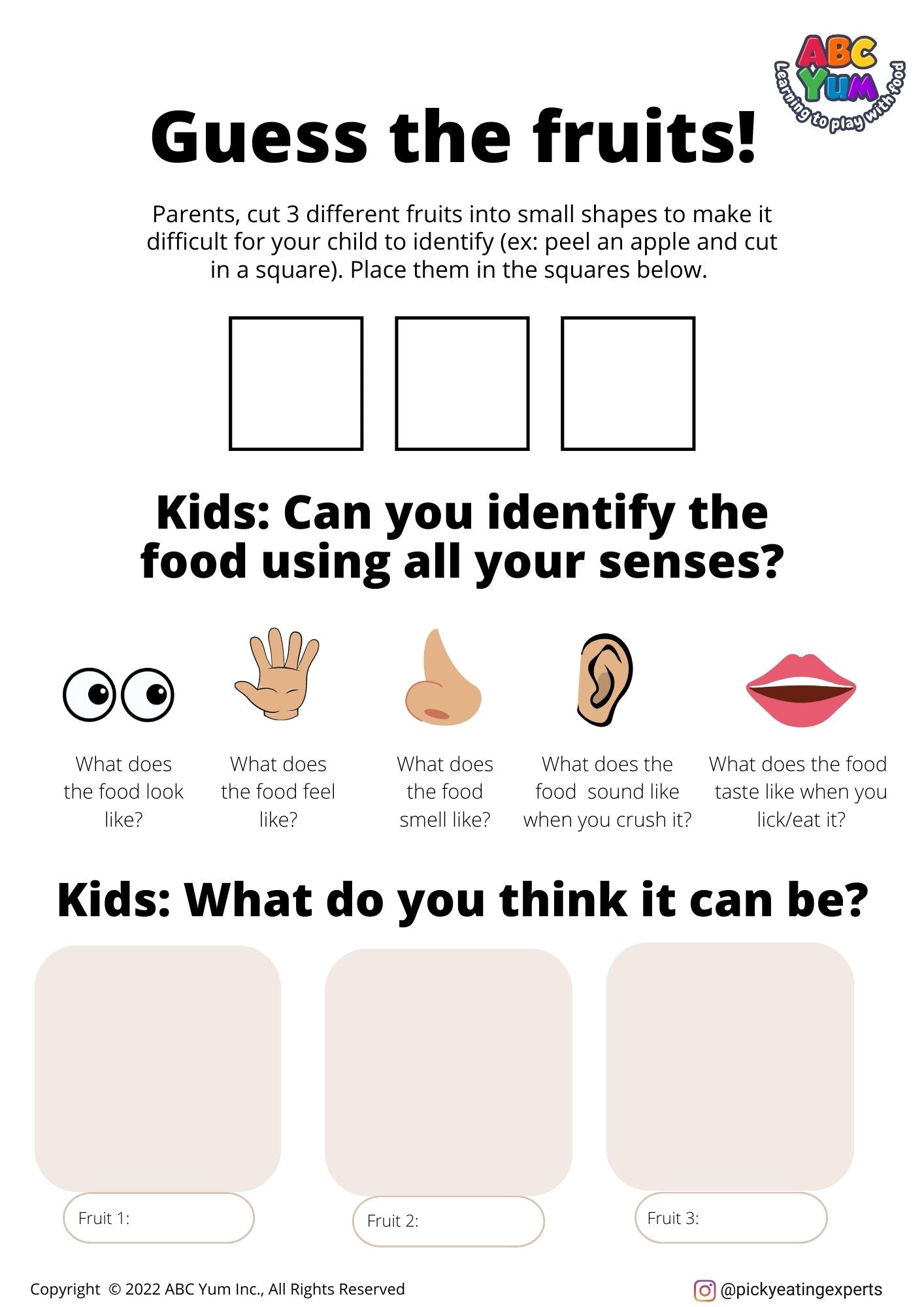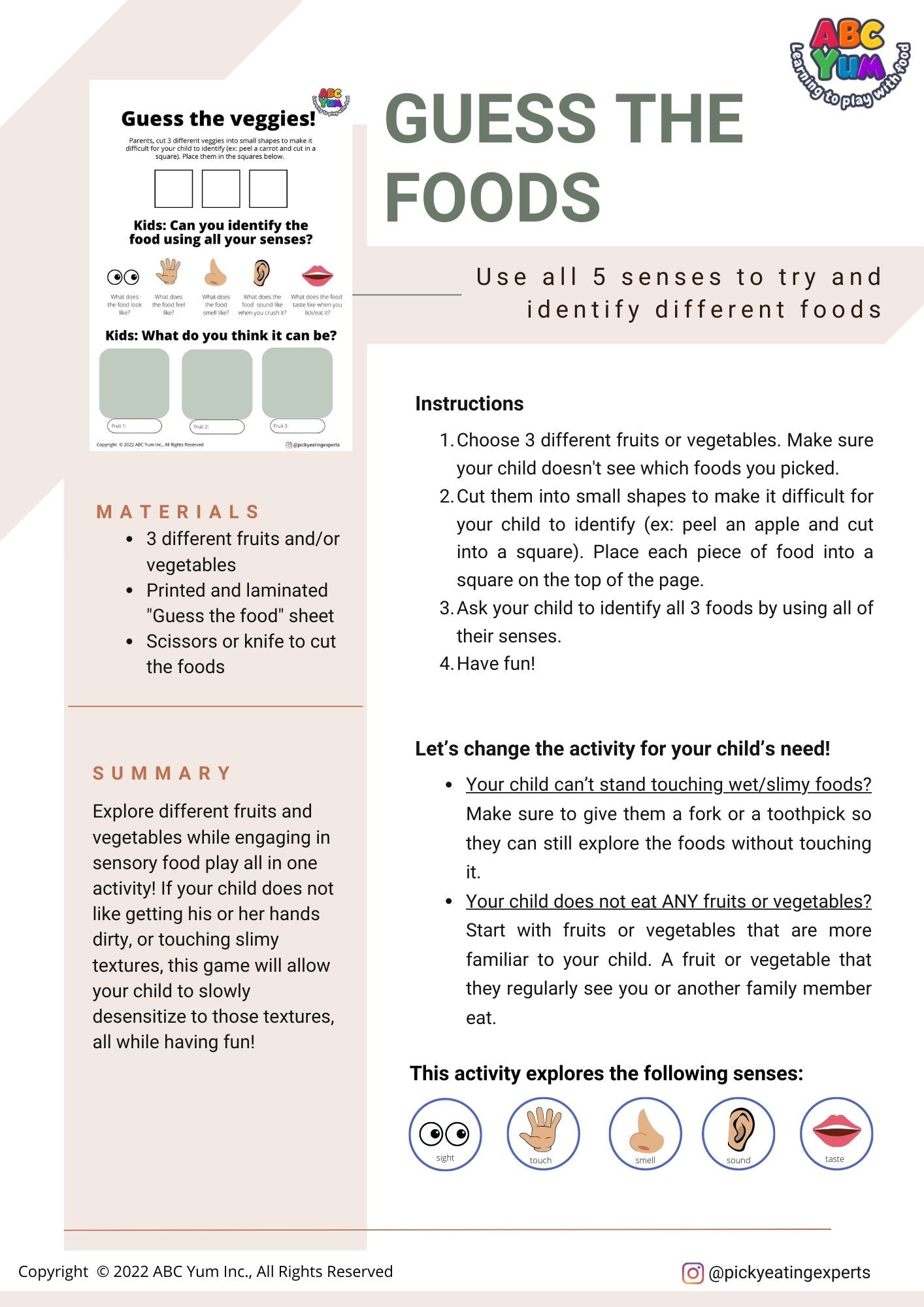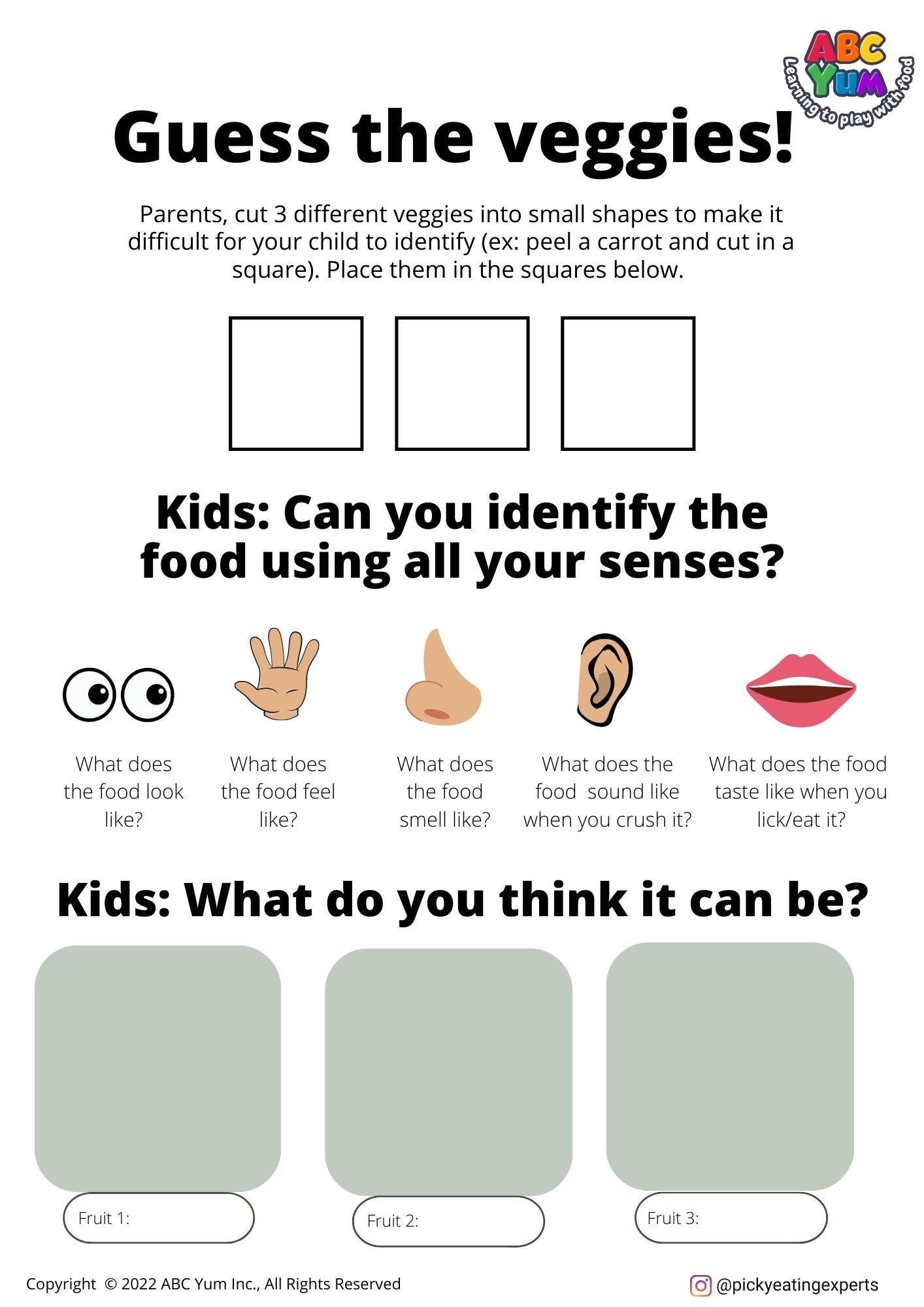 Cette activité fait travailler les 5 sens que nous utilisons lorsque nous mangeons. C'est un excellent moyen de motiver votre enfant à explorer et interagir avec de nouveaux aliments. Demandez-leur de mettre leur chapeau de détective, d'activer tous leurs sens, et de se préparer à identifier différents aliments.