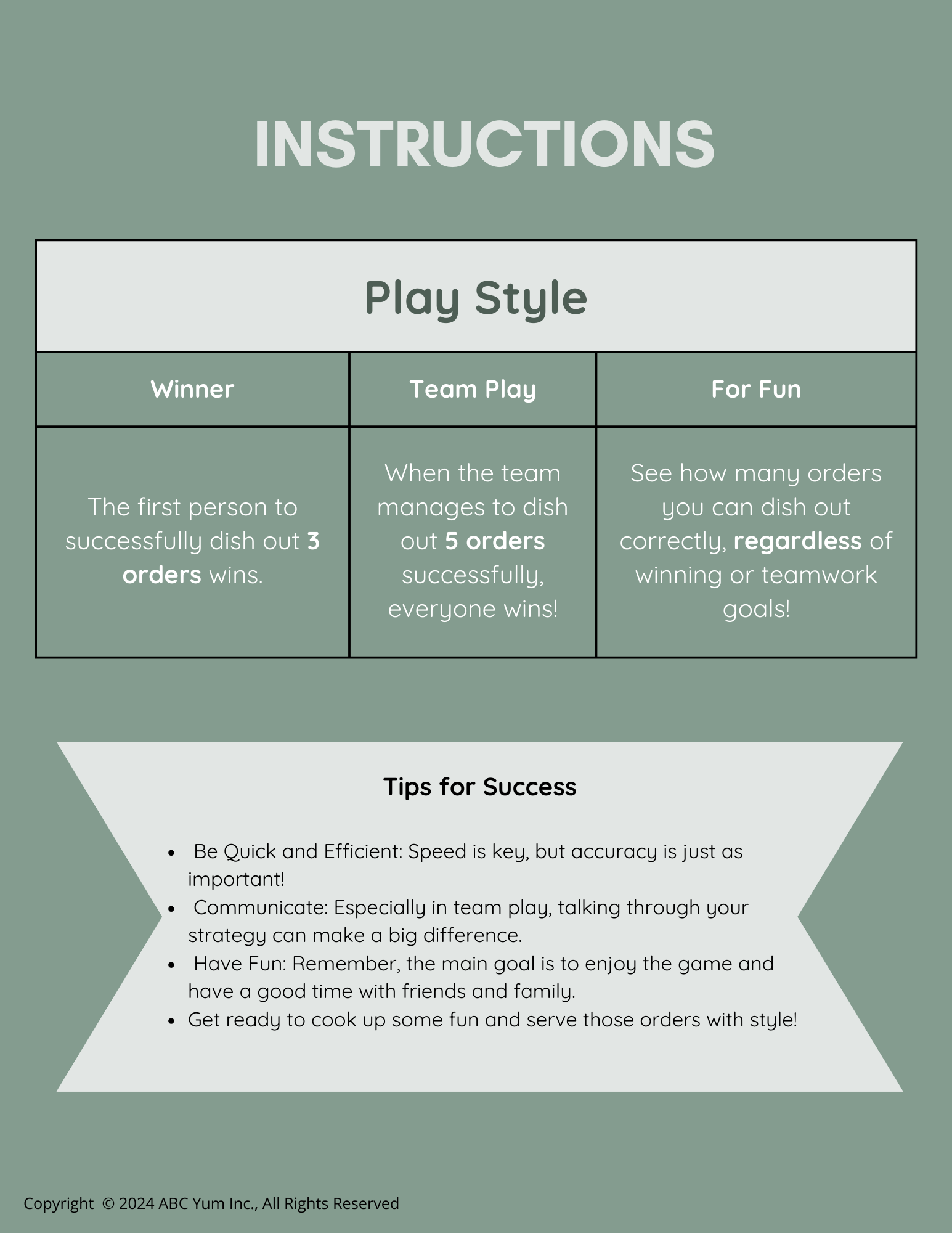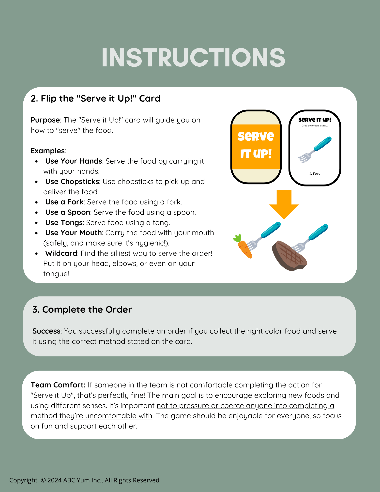Kids can play solo or as a team to collect and serve colorful "orders" using different utensils and silly methods. The goal? Complete orders correctly to win, all while making mealtimes less stressful and a lot more fun!